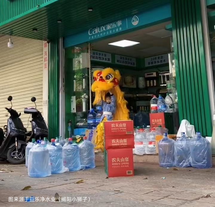大年初一,悅悅在父親自家經營多年的凈水器門市前練習,碰巧一支舞獅隊結束表演乘車路過,在等紅燈時他們看到了悅悅的表演,忍不住為她敲鑼打鼓,吶喊助威。這一刻,舞獅隊的鑼鼓聲與小女孩的舞獅技藝交相輝映,讓人熱血沸騰,激情澎湃!在揭陽這片充滿傳統文化韻味的土地上,悅悅用她的舞獅表演點亮了人們對傳統文化的熱愛與尊重,同時,也展現了新一代孩子對傳統文化的堅守與發揚!